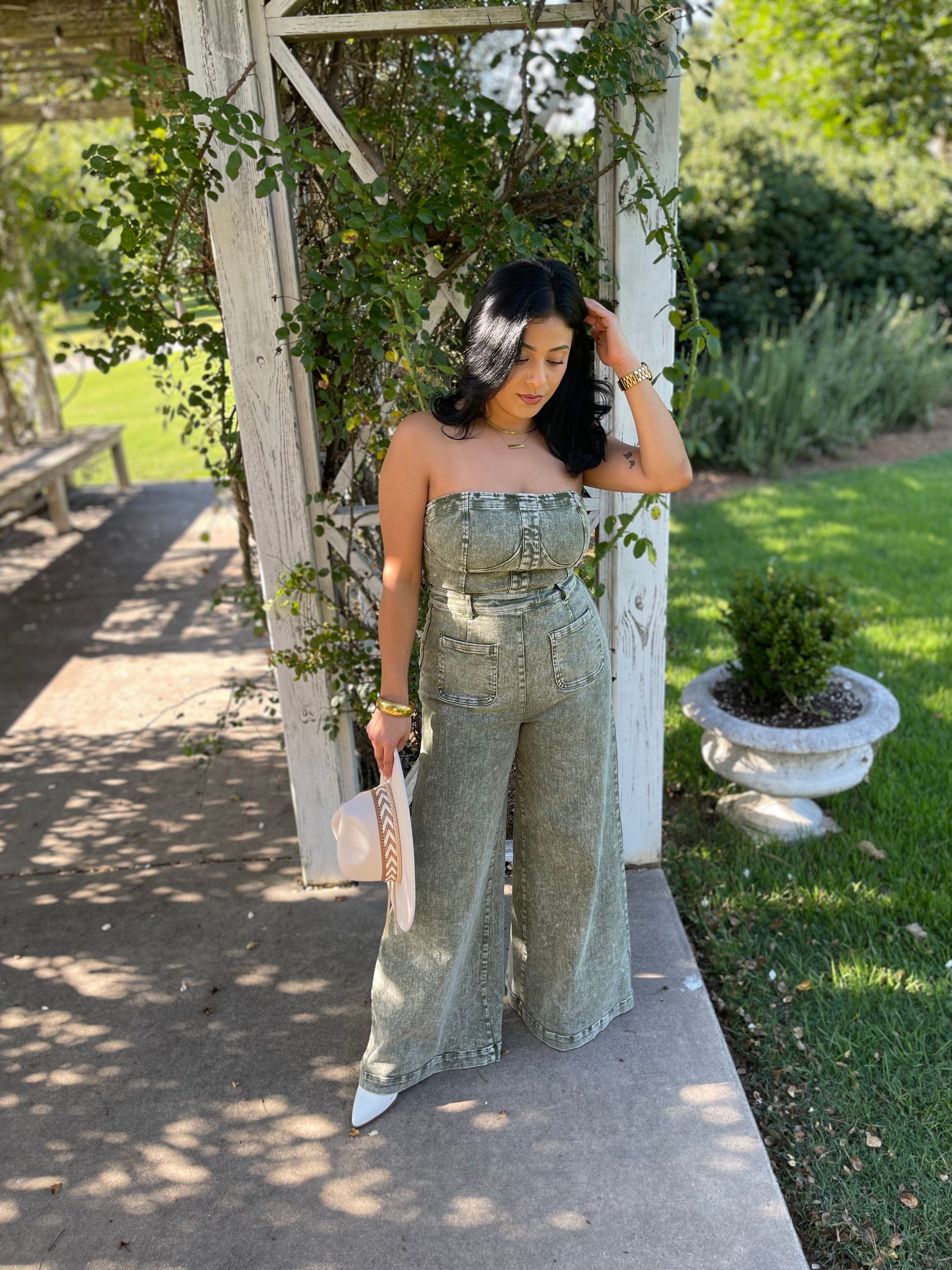 Olive Wide Leg Mineral Wash Tube Top Denim Jumpsuit